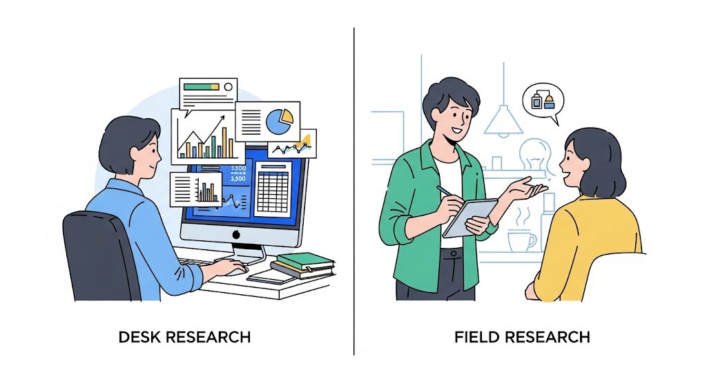 市場調査の手法は、大きく「デスクリサーチ(二次調査)」と「フィールドリサーチ(一次調査)」の2つに分けられます。それぞれに特徴があり、新規事業のフェーズや目的に応じて使い分けることが重要です。