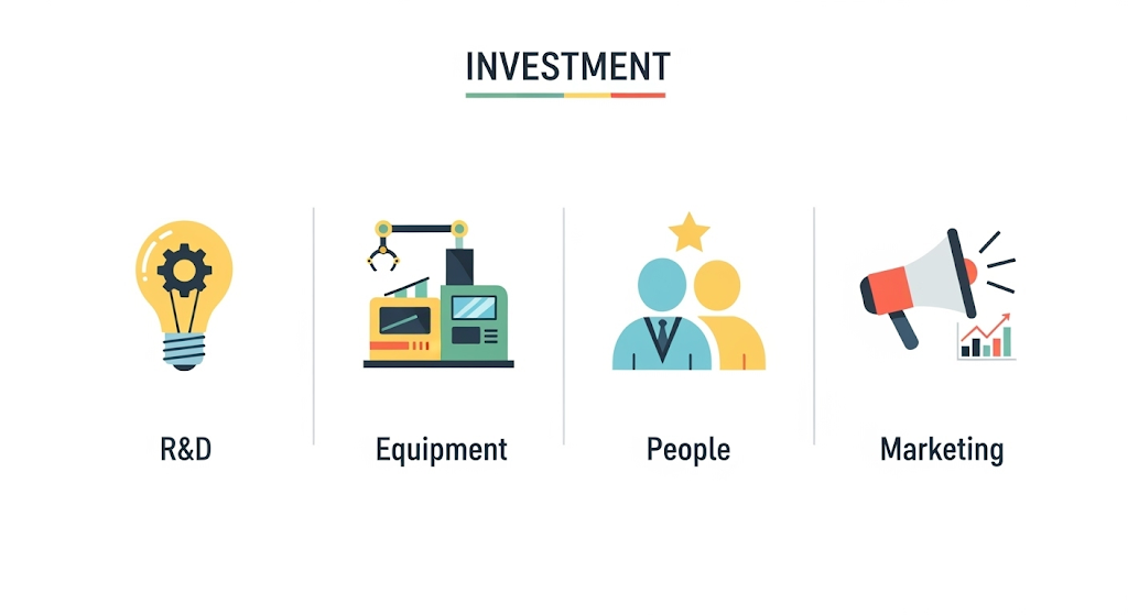 | 研究開発(R&D)投資 | 新しい技術やサービスのアイデアを創出し、実現可能性を探る | 基礎研究、応用研究、プロトタイプ開発費用、特許取得費用 | ・不確実性が最も高い・長期的な視点が必要・将来の競争優位性の源泉となる |